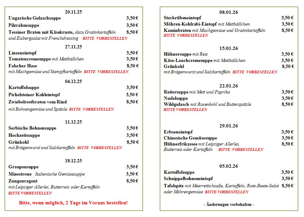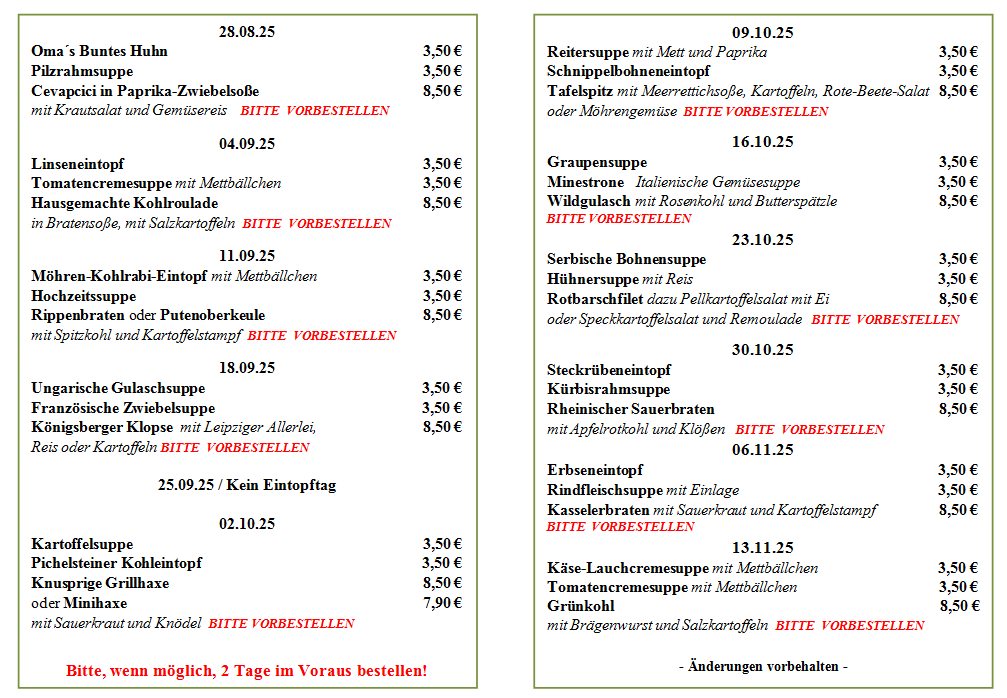 Wir sind für Sie da: Mittwoch bis Freitag ab 17:00 Uhr Samstag ab 11:00 Uhr Sonntag und an Feiertagen ab 10:00 Uhr Unsere Küche ist geöffnet: Mittwoch - Freitag 17:30 - 21:00 Uhr Samstag, Sonntag und an Feiertagen 11:00- 14:00 Uhr und 17:30 - 21:00 Uhr Mittags nur mit Voranmeldung Montag und Dienstag ist Ruhetag