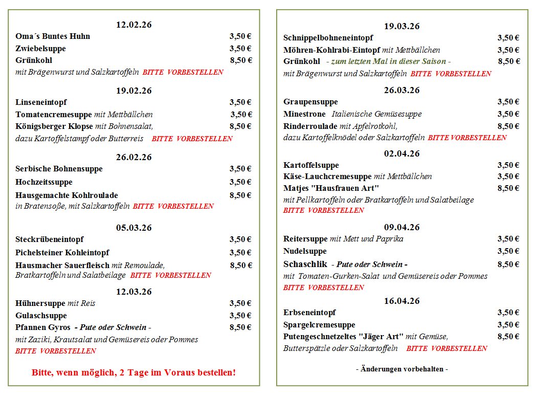 Elzer Weg 3 - 31036 Eime Tel. (05182) 6304 Fax (05182) 9609009 Frühstück: Täglich (außer Montag und Dienstag)